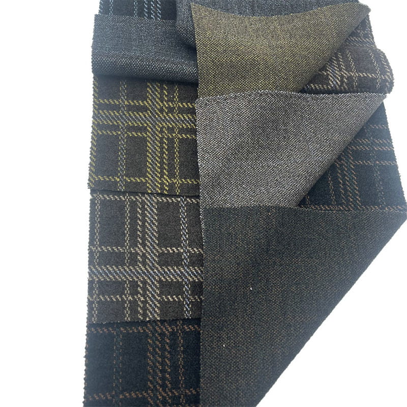 Este tejido, artículo 24037, es un tejido de punto jacquard 100% poliéster diseñado para pantalones. Presenta un patrón de cuadros de textura fina integrado en la construcción durante el proceso de tejido. Con una masa por unidad de superficie de 750 g/m2, el tejido posee una estructura definida y una densidad sustancial. La técnica jacquard permite la formación precisa del patrón clásico directamente en la superficie del tejido. Este peso y composición contribuyen a la caída y durabilidad del material. Los parámetros de la tela la hacen aplicable para pantalones entallados donde se requiere una silueta definida y un interés superficial.