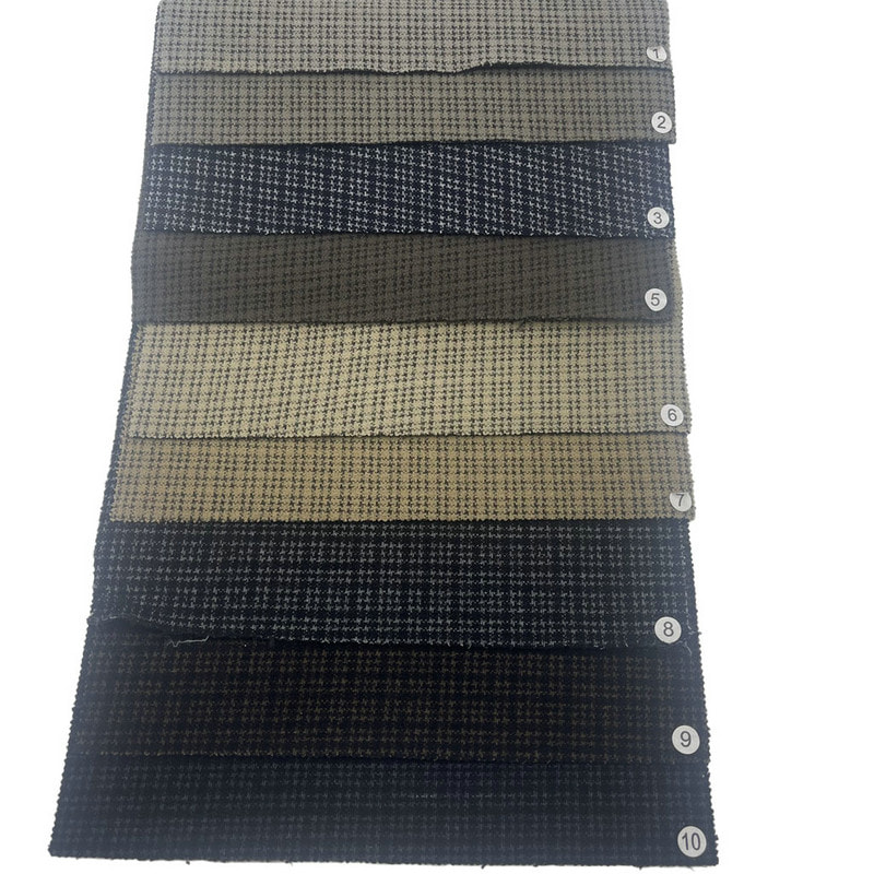 Este tejido, artículo 24090, es un tejido jacquard grueso elaborado con una mezcla de 62% poliéster y 38% nailon. Con una masa por unidad de área de 820 g/m3, el material exhibe una densidad y un peso sustanciales. La superficie presenta un patrón clásico de cuadros de pata de gallo integrado en la tela mediante el proceso de tejido jacquard. Esta técnica de fabricación crea un motivo geométrico preciso y repetitivo en toda la superficie textil. La combinación de poliéster y nailon contribuye a la integridad estructural y la estabilidad dimensional del tejido. Estas especificaciones técnicas dan como resultado un textil duradero adecuado para aplicaciones que requieren tanto un patrón de superficie definido como una presencia sustancial de material.