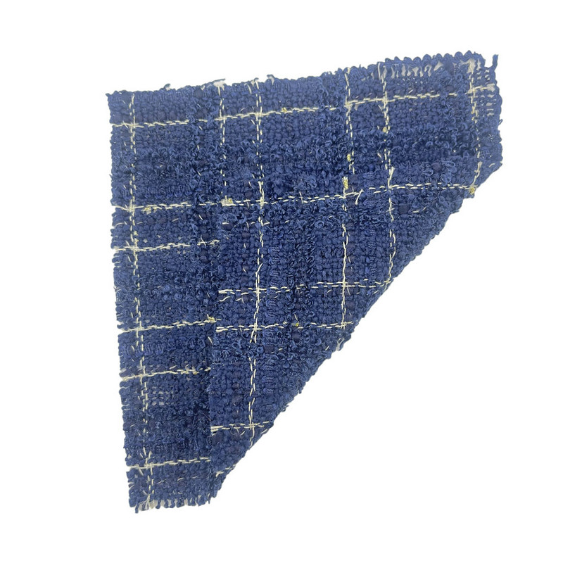 Este tejido, designado como artículo 19909-10, es un tweed 100% poliéster diseñado para prendas de vestir femeninas. Con una masa por unidad de superficie de 558 g/m, presenta una estructura de peso medio. La base azul oscuro está tejida con un patrón de cuadros, integrado con hilo metálico durante el proceso de fabricación. Esta combinación crea un contraste tanto en las propiedades visuales como táctiles. La composición totalmente de poliéster garantiza estabilidad dimensional y un rendimiento constante. La inclusión de elementos metálicos añade detalles que reflejan la luz a la superficie textil. Estas características hacen que el tejido sea adecuado para prendas donde se prioriza la integridad estructural y el efecto decorativo.