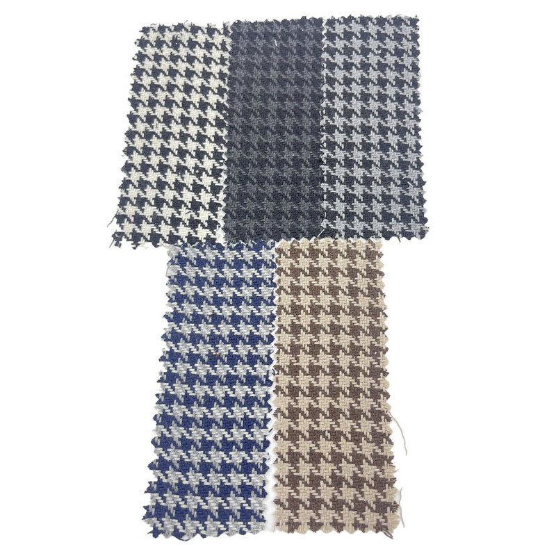 Este tejido, denominado artículo 3946, es un tejido compuesto por un 10% de lana y un 90% de otras fibras. Con una masa por unidad de superficie de 450 g/m3, presenta una construcción de peso medio. La superficie gris oscuro presenta un patrón de pata de gallo, creado mediante una técnica de tejido específica que produce cuadros rotos o formas de cuatro puntas. Este motivo geométrico clásico se caracteriza por su efecto tonal en contraste repetido. La composición de la mezcla de lana contribuye a la regulación térmica y la resistencia del tejido. Estas características técnicas dan como resultado un material con patrón de articulación definido y durabilidad estructural, lo que lo hace aplicable para sudaderas con capucha donde se requiere definición de patrón visual y rendimiento a largo plazo.