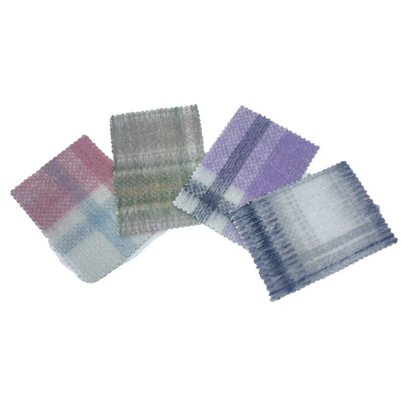 Este tejido, denominado artículo 3940, es un tejido jacquard compuesto por un 10% de lana y un 90% de otras fibras. Con una masa por unidad de superficie de 600 g/m, presenta una construcción pesada. La superficie violeta combina un patrón de cuadros con una textura de pelo largo, lograda mediante técnicas especializadas de tejido y acabado de jacquard. Este proceso de fabricación crea bucles de fibra extendidos en la superficie del tejido, lo que da como resultado una estructura tridimensional pronunciada. La composición de mezcla de lana contribuye a las propiedades de aislamiento térmico y resistencia del tejido. Estas características técnicas producen un material con una profundidad y un volumen de superficie sustanciales, lo que lo hace aplicable para abrigos donde se requiere calidez y dimensión textural elevadas.