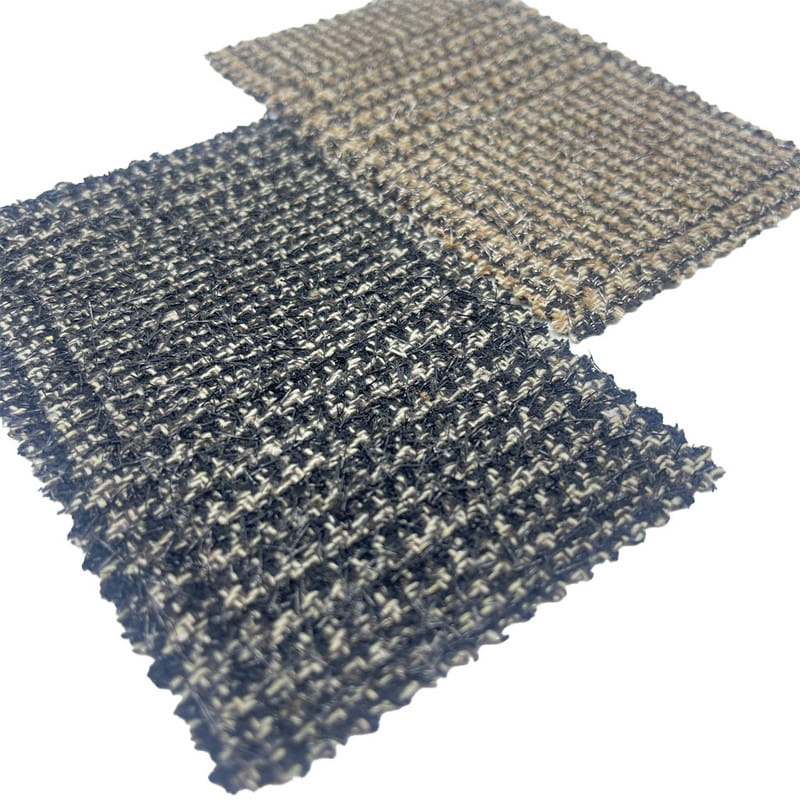 Este tejido, denominado artículo 4336, es un tejido de tweed compuesto por un 5% de lana y un 95% de otras fibras. Con una masa por unidad de superficie de 550 g/m2, presenta una construcción pesada. La superficie negra y marrón combina un patrón de cuadros con un motivo de pata de gallo, integrado con hilo metálico durante el proceso de tejido. Esta técnica crea un diseño compuesto donde los patrones geométricos se acentúan mediante elementos que reflejan la luz. La inclusión de hilo metálico introduce efectos visuales contrastantes con la base tejida. Las especificaciones técnicas dan como resultado un material con complejidad visual de múltiples capas y densidad estructural, lo que lo hace aplicable para proyectos donde se requiere articulación de patrones y variación de superficie.