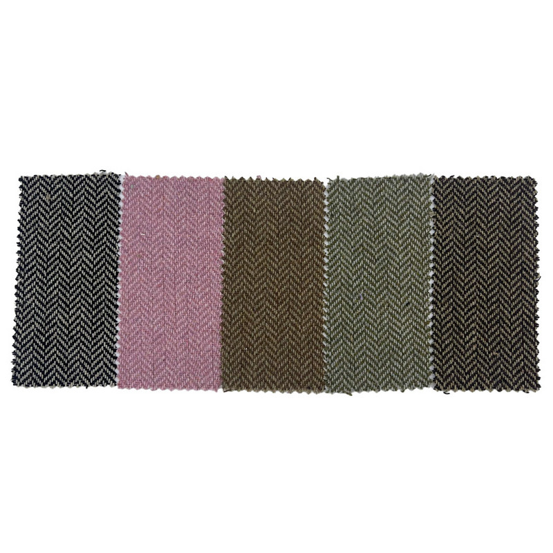 Este tejido, denominado artículo 3532, es un tejido jacquard compuesto por un 20% de lana y un 80% de otras fibras. Con una masa por unidad de superficie de 500 g/m3, presenta una construcción de peso medio a pesado. La superficie rosa presenta un patrón de espiga creado mediante el proceso de tejido jacquard, que forma motivos precisos en forma de V en toda la tela. Esta técnica produce una textura direccional consistente con repetición geométrica definida. La composición de mezcla de lana contribuye a las propiedades térmicas del tejido y a la retención de su forma. Estas características técnicas dan como resultado un material con densidad estructural y claridad de patrón, lo que lo hace aplicable para pantalones donde se requiere definición visual y estabilidad dimensional.
