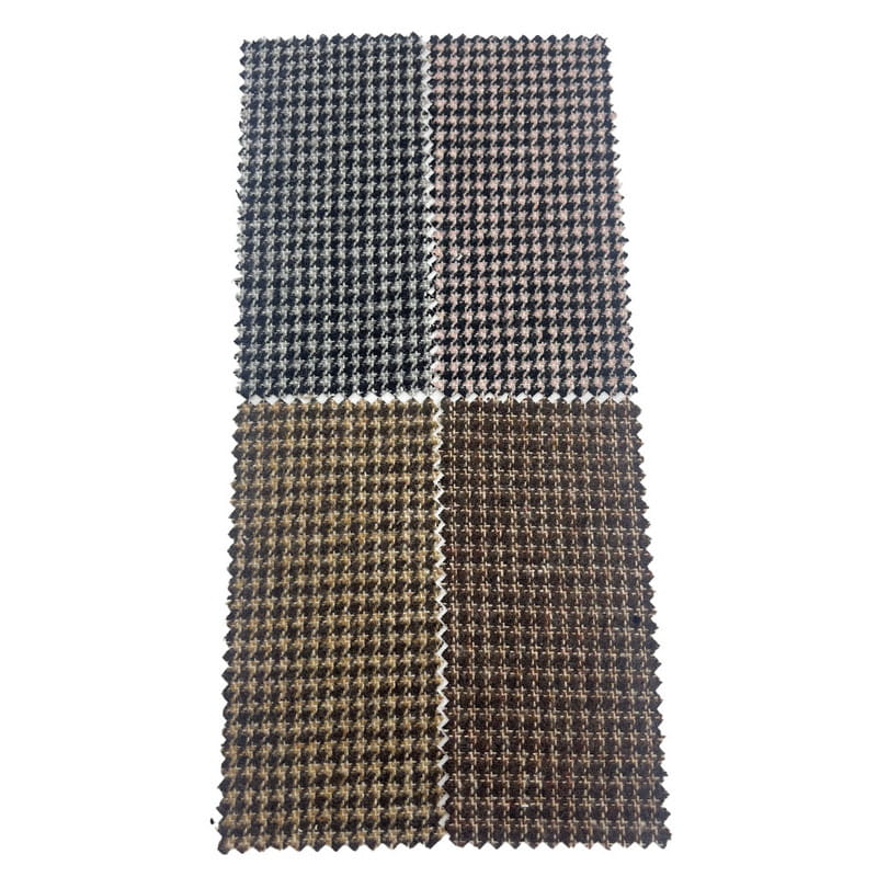 Este tejido, denominado artículo 4334, es un tejido de tweed compuesto por un 35% de lana y un 65% de otras fibras. Con una masa por unidad de superficie de 450 g/m3, presenta una construcción de peso medio. La superficie combina un patrón de pata de gallo con elementos de cuadros, creando un diseño geométrico compuesto mediante técnicas de tejido precisas. Este método de construcción produce cuadros rotos entrelazados con un contraste de color definido en toda la tela. La composición de mezcla de lana contribuye a la estabilidad dimensional del tejido y a su resistencia a las arrugas. Estas características técnicas dan como resultado un material con una articulación de patrón intrincada y durabilidad estructural, lo que lo hace aplicable para pantalones donde se requieren patrones detallados y rendimiento a largo plazo.