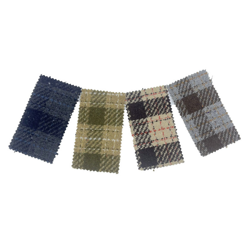 Este tejido, denominado artículo 4144, es un tejido de tweed jacquard compuesto por un 10% de lana y un 90% de otras fibras. Con una masa por unidad de superficie de 550 g/m2, presenta una construcción pesada. La superficie verde combina una base de tejido de sarga con patrones de cuadros a rayas, creados mediante el proceso de jacquard que integra bandas lineales con formaciones de cuadrícula. Esta técnica produce patrones que se cruzan sobre la característica textura de sarga diagonal. La composición de la mezcla de lana contribuye a la estabilidad dimensional y la durabilidad del tejido. Estas características técnicas dan como resultado un material con patrones de múltiples capas y densidad estructural, lo que lo hace aplicable para prendas de vestir donde se requieren elementos de diseño complejos y resistencia de la tela.