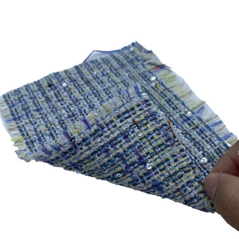 Este tejido, denominado artículo ZZH24018, es un tejido de tweed compuesto por un 20% de lana y un 80% de poliéster. Con una masa por unidad de superficie de 560 g/m2, el material presenta una construcción de peso medio. La tela incorpora lentejuelas metálicas fijadas dentro de la estructura de tweed, creando un reflejo de luz intermitente en toda la superficie. La mezcla de lana y poliéster proporciona un equilibrio entre las características de las fibras naturales y la consistencia estructural. Esta combinación da como resultado un material con variación de textura superficial y estabilidad dimensional. Estas especificaciones hacen que esta tela de tweed sea aplicable para abrigos de vestir de mujer donde se consideran tanto el interés visual como el rendimiento práctico.